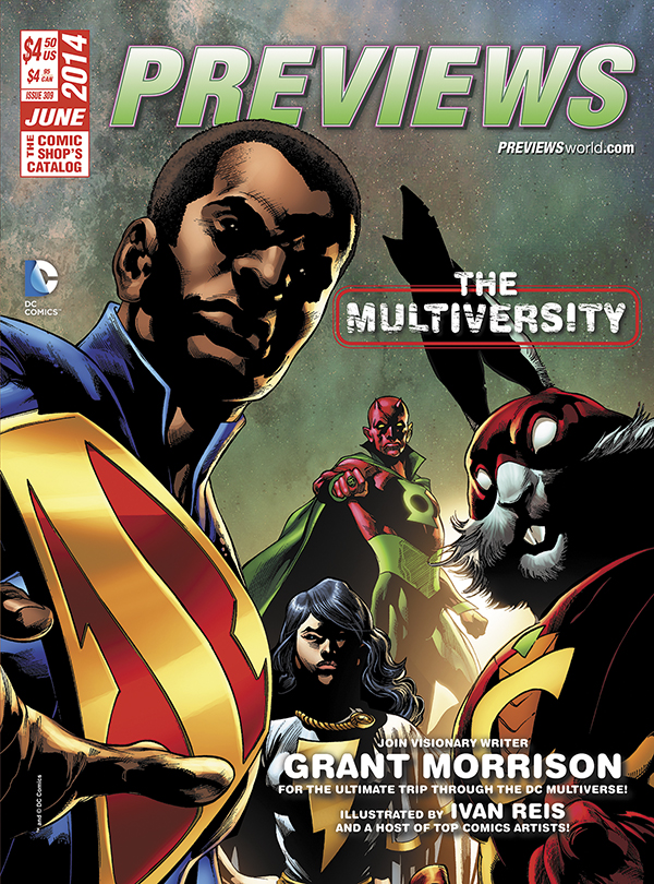 Grant Morrison has been teasing it for years, but the epic Multiversity storyline will finally be hitting comic shop shelves later this summer. If you needed more proof, DC Comics’ The Multiversity graces the coveted front cover of the June edition of PREVIEWS, Diamond Comic Distributors’ monthly catalog of items it ships to stores, which will be available next week.