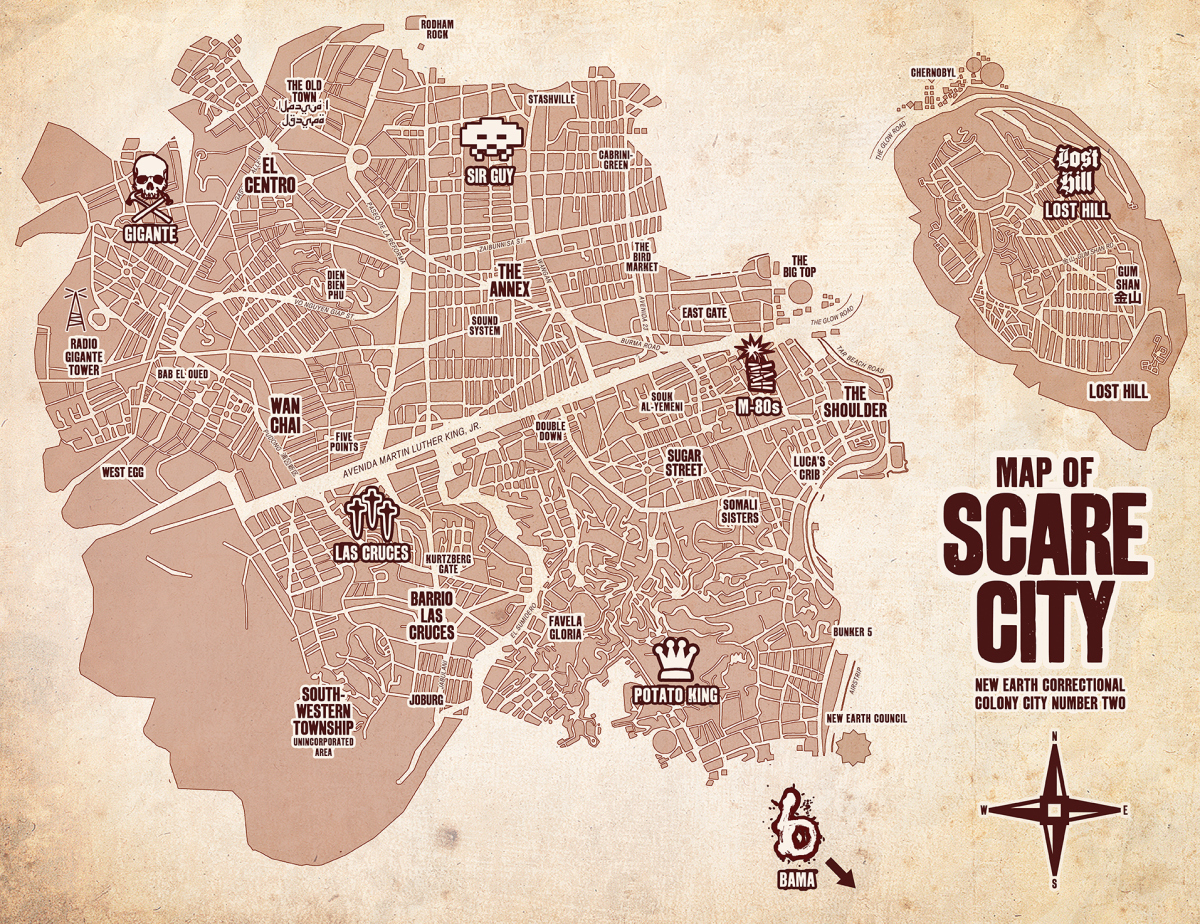 Scare City (aka New Earth Correctional Facility Number Two) — the world of Concrete Park — is a distant and hostile planet. Think Tatooine crossed with Mad Max’s wasteland, the summer depicted in Spike Lee’s Do the Right Thing, and John Carpenter’s Escape from New York, with a dash of São Paulo — and you almost get the picture.