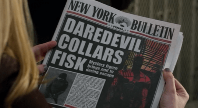 “Daredevil? That’s what they’re calling him now.” Says Karen as she reads the headline in the paper. The three amigos joke that it sounds like he’s going to jump a canyon, but it’s better than the Devil of Hell’s Kitchen. Karen is in awe that it’s the same guy that saved her, but Foggy comes back with “I think the horns are a bit much.” Hater. Karen fished the sign out of the trash and it’s now up and Matt drops one last “Nelson and Murdock; avocados at law.” Marci’s out of work, but Foggy’s helping her out and it seems like the avocados may have some space. They worry a bit about the timeline of Fisk to trial, but Matt tells them he’s where he belongs. They enjoy the sign, but Foggy says now what they need are clients. Matt mentions he’s heard a change in Karen’s voice he thought would improve after Fisk was taken care of, but he tells her it hasn’t. She tells him it won’t bring back Elena or Ben, erase what they’ve been through, or what they’ve done to get to this point. Matt tells her all they can do is move forward together, and offers her his hand. They share a brief sexually tense moment before entering their office.