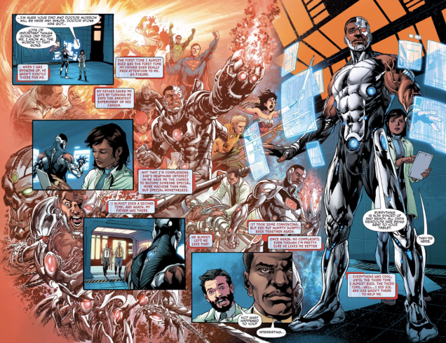 - Cyborg is a human. He isn’t just an anthropomorphized machine. In just the first issue we are made privy to Vic Stone’s issues with his father and his father’s colleagues, a potential love interest — who Vic is pretty much blind to — who sees beyond and through the mechanized parts, and (praise every god/dess available) we get a complex interiority that so many superheroes of color never get.